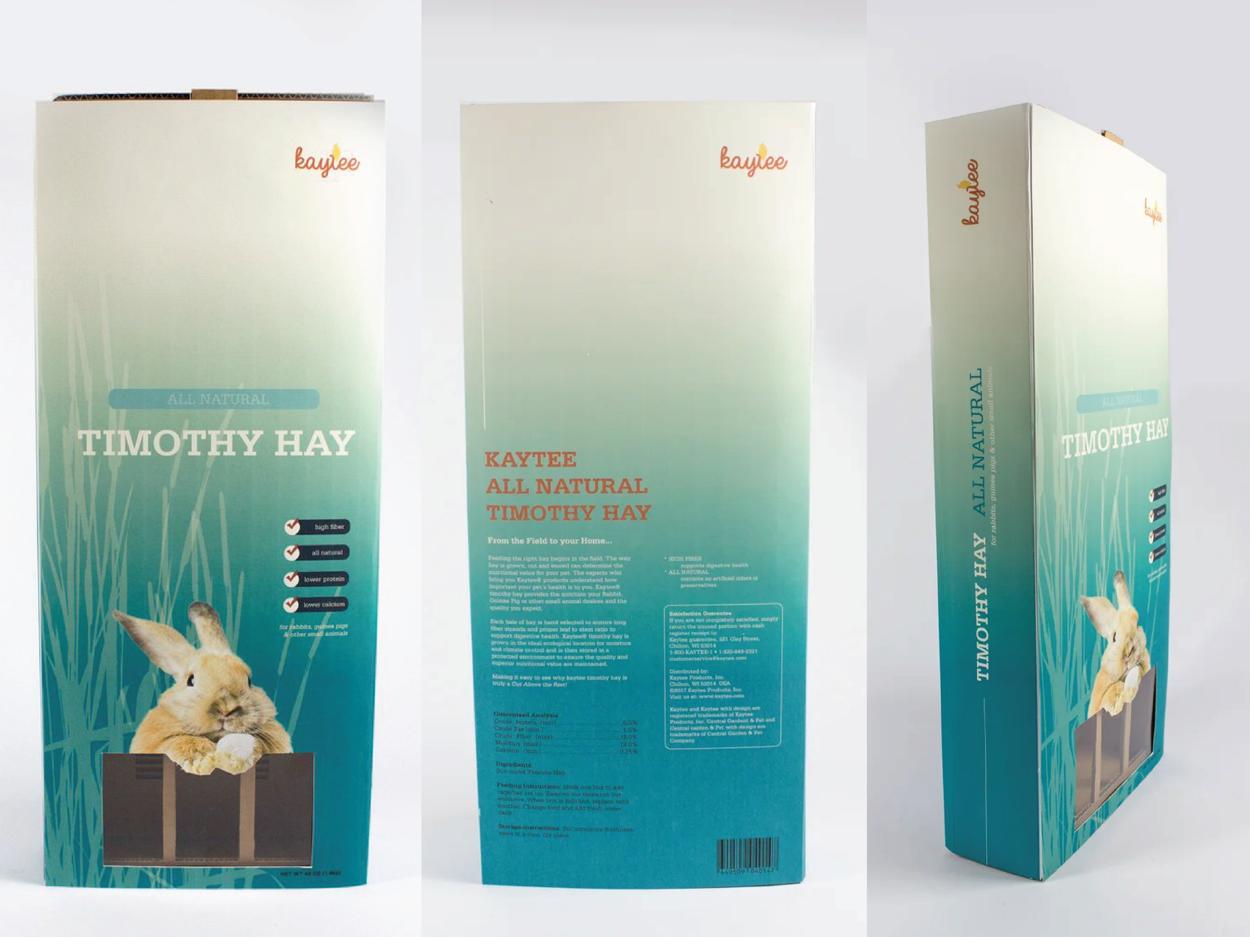 From low quality products to wasteful high plastic packaging, the 2018 small pet consumer market left very much to be desired. Hay, the main food source for rodents and lagomorphs, is one of the top contributors that increase hay allergies in humans. The kickback of dust as one pulls hay out from bags or boxes generally causes lung sensitivities to eye irritation. My question became - how then can I create a packaging concept the fulfills the following criteria: reusable, recyclable, has ease of use, no need to touch hay (therefore mitigating dust flying), single use